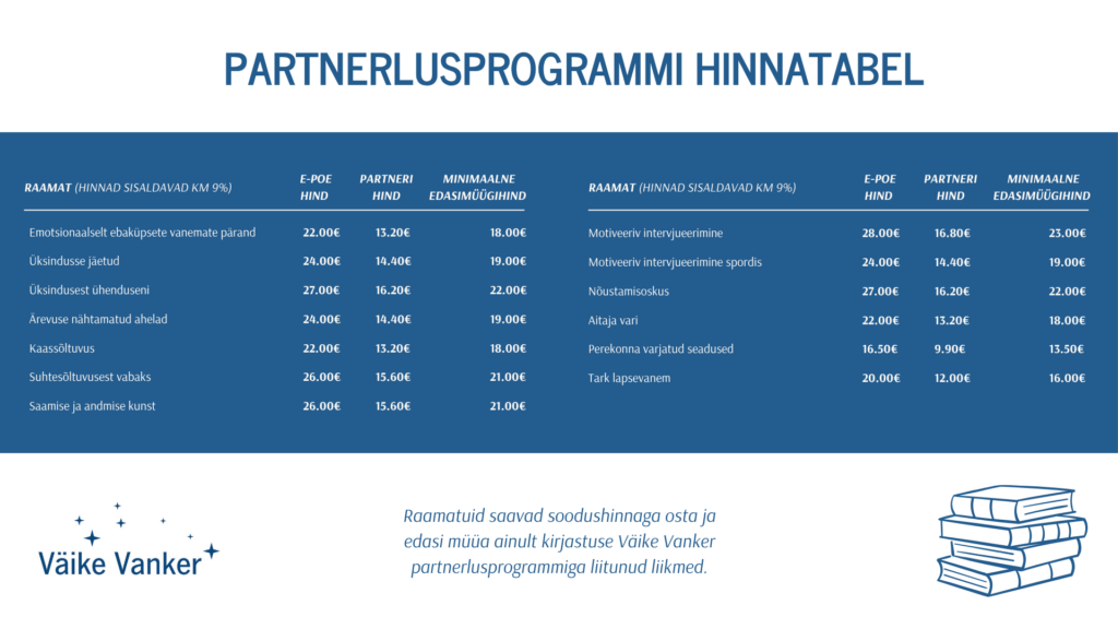 NB! Soodushind rakendub toodetele, mida on korvis vähemalt viis eksemplari. Lisaks on Omniva pakiautomaati tellides saatmine tasuta. - Hinnakujunduse vabadus. Programmis osalejad võivad ise määrata raamatute edasimüügihinna, optimeerides nii oma tulu, kuid see ei tohi olla väiksem, kui Väikse Vankri määratud minimaalne edasimüügihind (vt tabelit allpool).